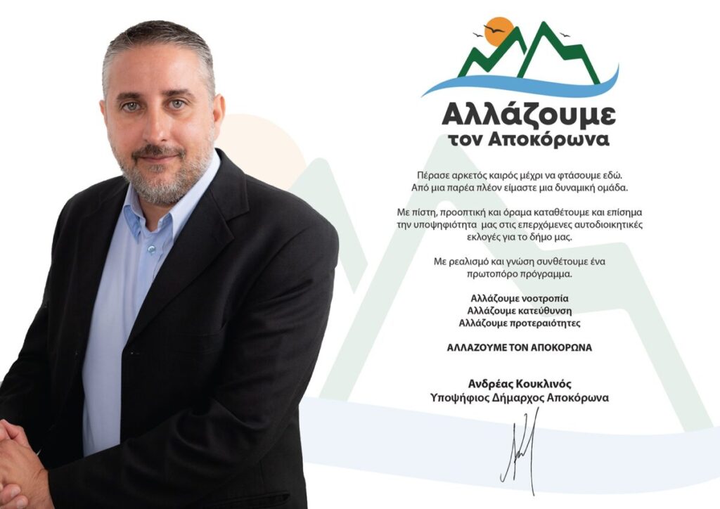 Μετά τον νυν δήμαρχο Χαράλαμπο Κουκιανάκη, αλλά και τον Κώστα Γύπαρη ήρθε και η ανακοίνωση υποψηφιότητας του Ανδρέα Κουκλινού, νυν περιφερειακού συμβούλου, αλλά πρώτη φορά σαν υποψήφιος δήμαρχος.