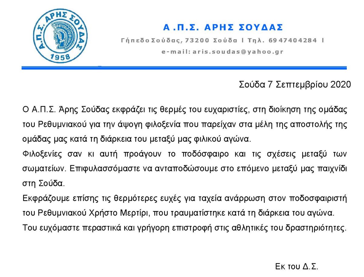 Γ' ΕθνικήΆρης Σούδας: Ευχαριστεί τον Ρεθυμνιακό – Περαστικά στον Μερτίρι 07 Σεπ Δείγμα των καλών σχέσεων των ομάδων της Κρήτης Η ανακοίνωση του Άρη Σούδας αναφέρεται και στον τραυματισμό του ποδοσφαιριστή της ομάδας του Ρεθυμνιακού Μερτίρι στον οποίο εύχεται περαστικά.