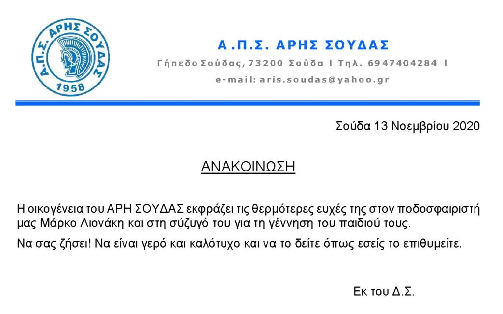 Άρης ΣούδαςΆρης Σούδας: Ευχές σε παίκτη της ομάδας που έγινε “μπαμπάς” 14 Νοέ Ο Μάρκος Λιονάκης του Άρη Σούδας έγινε πατέρας και η ομάδα του τού εύχεται. Οι ευχές του Άρη Σούδας