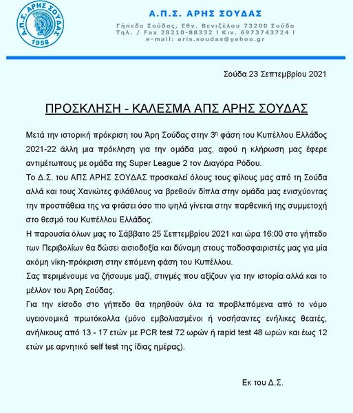 Άρης Σούδας, IN THE SPOTLIGHT, Κύπελλο ΕλλάδοςΆρης Σούδας: Το κάλεσμα για το ματς με τον Διαγόρα 23 Σεπ Ο Άρης Σούδας εξέδωσε κάλεσμα στον κόσμο να ενισχύσει την ομάδα στα Περιβόλια για το ματς με τον Διαγόρα Ρόδου. Αναλυτικά: