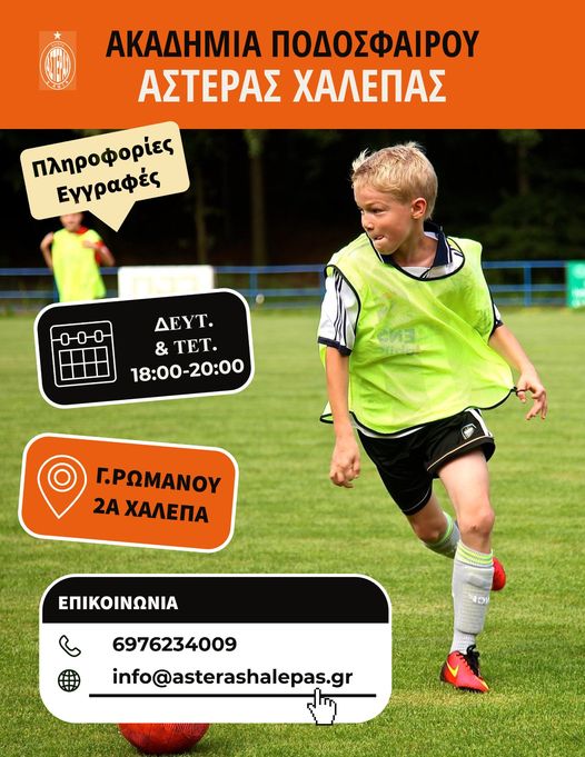 | Τι αναφέρει η ομάδα του Αστέρα Χαλέπας. Ξεκίνησαν οι εγγραφές για παιδιά ηλικίας απο 5 ετών, στην ακαδημία ποδοσφαίρου του Αστέρα Χαλέπας. Οι ενδιαφερόμενοι γονείς και παιδιά μπορουν μα προσέρχονται στα γραφεία της ομάδας Γ.Ρωμανού 2Α (Έναντι Ιερού Ναού Ευαγγελιστρίας στην Χαλέπα) Δευτέρα και Τετάρτη 18:00-20:00 ή να επικοινωνούν στο τηλέφωνο 6976234009. |