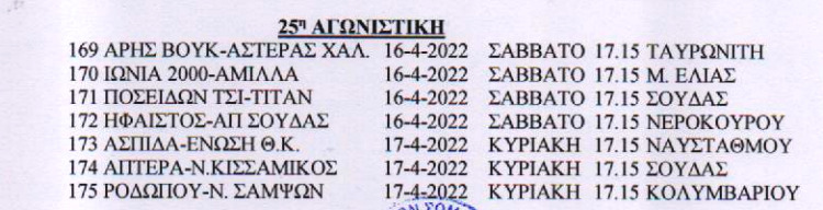 Η Ιωνία παίζει την προτελευταία αγωνιστική με την Άμιλλα στη Μοναχή Ελιά και την τελευταία με τον Σαμψόντα στον Αποκόρωνα (Νιο Χωριό).