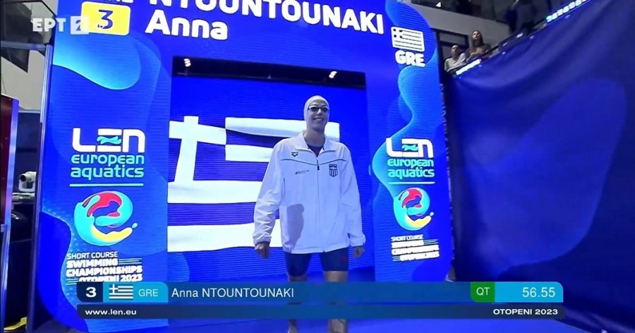 Ανήμερα της ονομαστικής εορτής η Άννα Ντουντουνάκη κατέκτησε το τέταρτο μετάλλιό της σε Ευρωπαϊκό πρωτάθλημα κολύμβησης 25άρας πισίνας. Τερμάτισε στη 3η θέση στον τελικό στα 100μ πεταλούδα με 55.98, που συνιστά ένα σπουδαίο πανελλήνιο ρεκόρ. Γίνεται η πρώτη Ελληνίδα που «κατεβαίνει» τα 56.00 αφού είχε το ρεκόρ με 56.26 από το 2021.