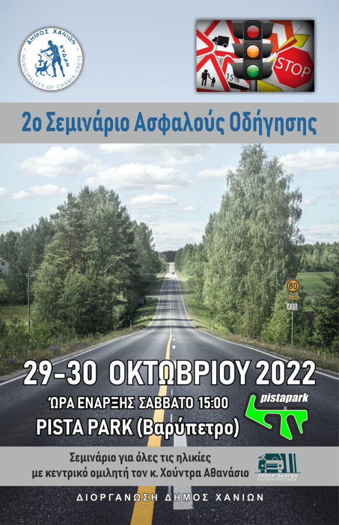 Ο Δήμος Χανίων διοργανώνει το 2ο διήμερο σεμινάριο ασφαλούς οδήγησης, με μέριμνα του Γραφείου Αθλητισμού, το οποίο θα πραγματοποιηθεί στις 29 & 30 Οκτωβρίου 2022 στην Pista-Park, στο Βαρύπετρο Αγιάς.