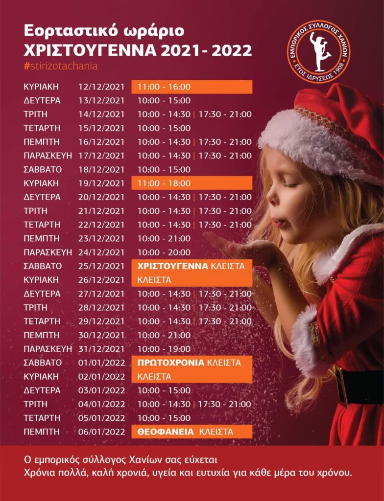 Σας ενημερώνουμε ότι το προτείνομενο ωράριο λειτουργίας των Εμπορικών καταστημάτων για την εορταστική περίοδο Χριστουγέννα 2021-2022 διαμορφώνεται σύμφωνα με τον παρακάτω πίνακα.