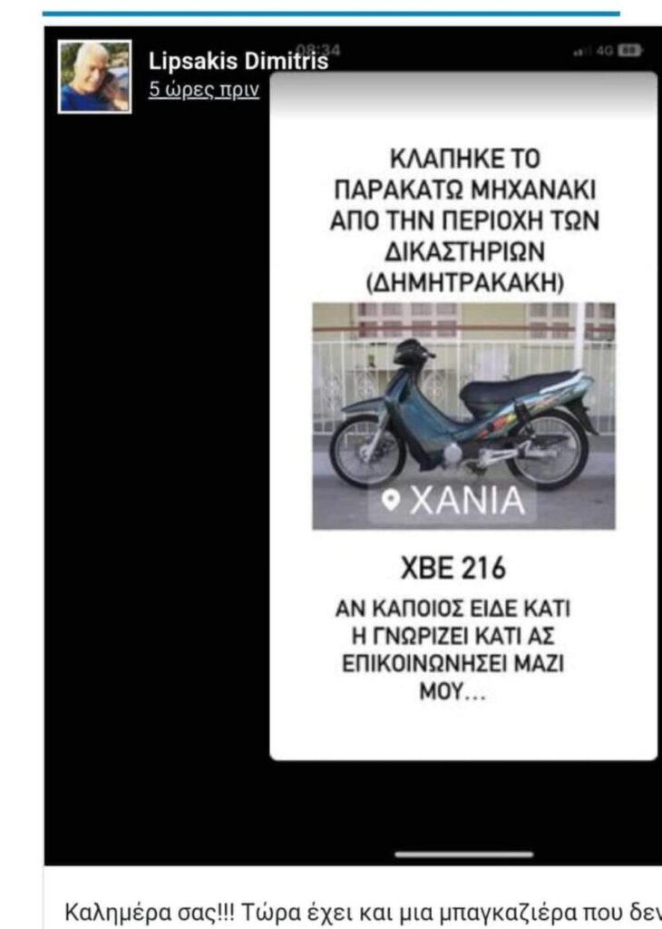 Άγνωστος ή άγνωστοι έκλεψαν το μηχανάκι του το οποίο ήταν σταθμευμένο στην οδό Δημητρακάκη.