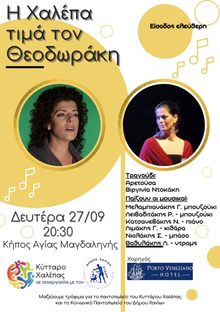 Την Δευτέρα 27 Σεπτεμβρίου 2021 και ώρα 20:30 θα πραγματοποιηθεί ζωντανή συναυλία από το «Κύτταρο Χαλέπας» σε συνεργασία με τον Δήμο Χανίων, στον κήπο της Αγίας Μαγδαληνής, για τα 96 χρόνια δραστήριας και δημιουργικής ζωής του Μίκη Θεοδωράκη.