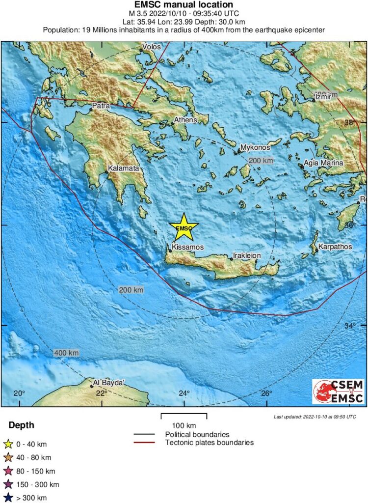 Σεισμική δόνηση μεγέθους 3,5 ρίχτερ έλαβε χώρα το μεσημέρι της Δευτέρας, στη 1:35. Η σεισμική δόνηση είχε επίκεντρ 48 χιλιόμετρα ΒΒΔ των Χανίων. Το εστιακό του βάθος ήταν 30 χιλιόμετρα.