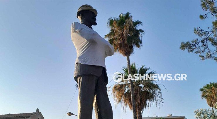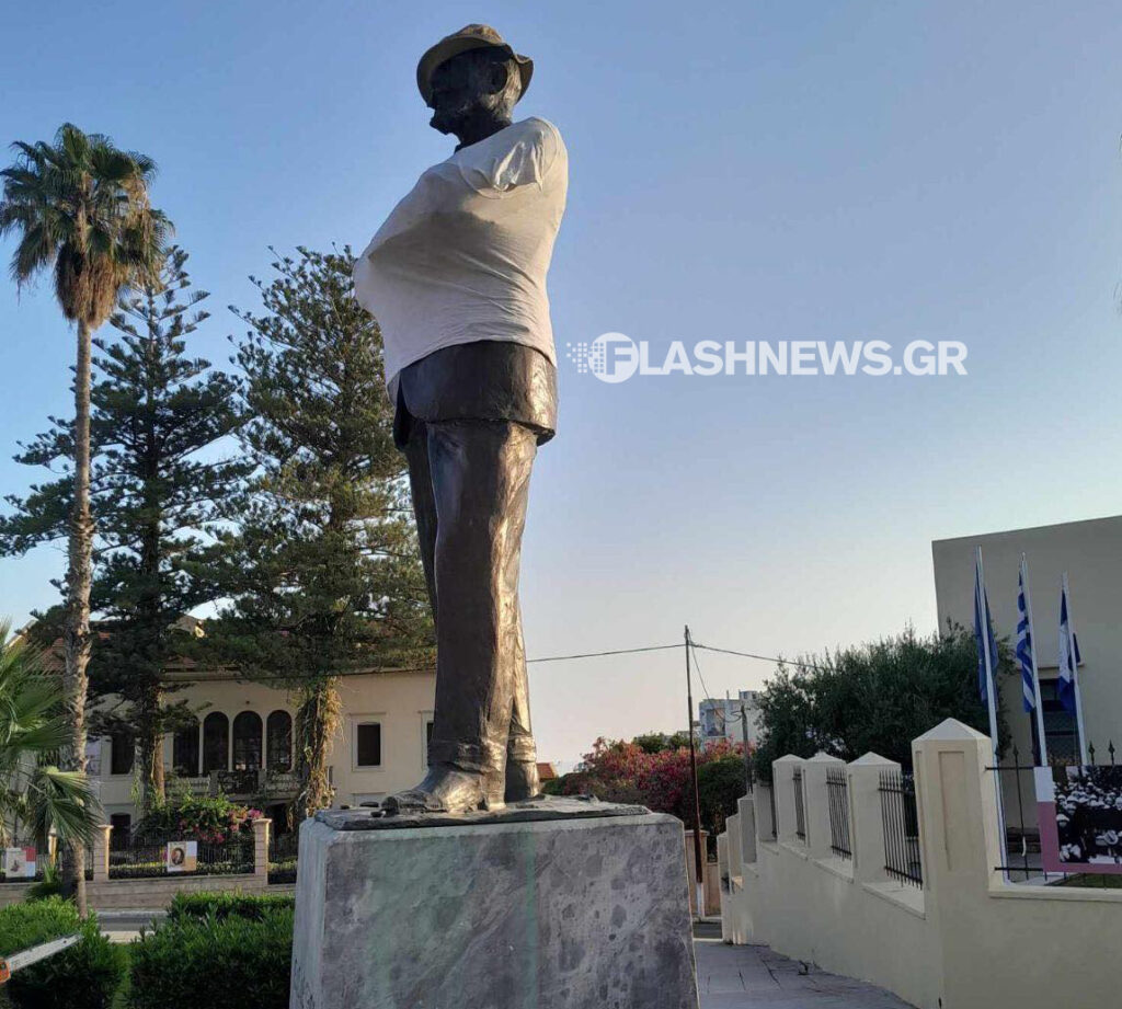 Συνεργείο καθαριότητας του δήμου Χανίων αφαίρεσε τα ρούχα από το άγαλμα του Εθνάρχη και αποκατέστησε την καθαριότητα.