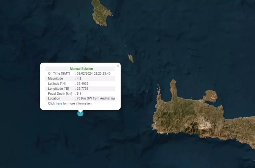 Ο σεισμός που έγινε στις 3:20 τα ξημερώματα είχε μέγεθος 4,3 βαθμούς της κλίμακας Ρίχτερ, με εστιακό βάθος τα 5,1 χλμ., και επίκεντρο τα 70 χλμ. νοτιοδυτικά των Αντικυθήρων και περίπου ίδιας απόστασης, δυτικά της Κισάμου.