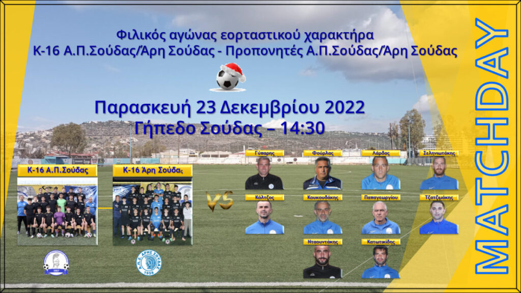 Στο πλαίσιο της διακοπής των προπονήσεων και των αγωνιστικών υποχρεώσεων των ομάδων λόγω των εορτών, θα διεξαχθεί την Παρασκευή 23 Δεκεμβρίου 2022 (14:30) στο Γήπεδο της Σούδας Φιλικός αγώνας εορταστικού χαρακτήρα μεταξύ των Τμημάτων Κ16 και ομάδας των Προπονητών της Α.Π.Σούδας & Άρη Σούδας.
