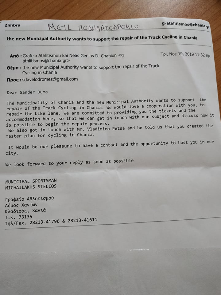 Το Flashnews εξασφάλισε το έγγραφο (e-mail) που εστάλη στον Ολλανδό κατασκευαστή, ονόματι Sander Duma, και υπογράφεται εκ μέρους του Δήμου Χανίων από τον Αντιδήμαρχο Αθλητισμού Στέλιο Μιχαηλάκη.