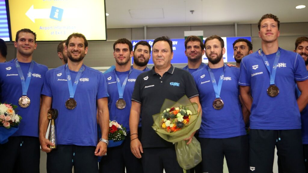 Η Εθνική ομάδα πόλο των ανδρών προσγειώθηκε στην Ελλάδα με το χάλκινο μετάλλιο από το Παγκόσμιο πρωτάθλημα που έγινε στην Σιγκαπούρη, με πλήθος κόσμου να υποδέχεται τους παίκτες του Θοδωρή Βλάχου. Κατά την άφιξη της, την υποδέχτηκαν ο αναπληρωτής Υπουργός Αθλητισμού, Γιάννης Βρούτσης, ο γενικός γραμματέας Αθλητισμού, Γιώργος Μαυρωτάς και συγγενικά τους πρόσωπα, ενώ δεν έλειψαν και οι φωτογραφίες με μικρούς φίλους που είδαν τους αγαπημένους τους αθλητές από κοντά.