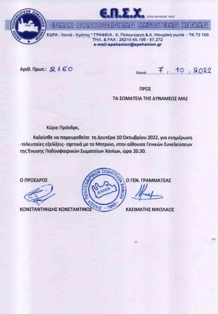 Περίπου δύο εβδομάδες μετά την προηγούμενη, η ΕΠΣ Χανίων καλεί τα σωματεία σε νέα σύσκεψη στα γραφεία της Ένωσης.