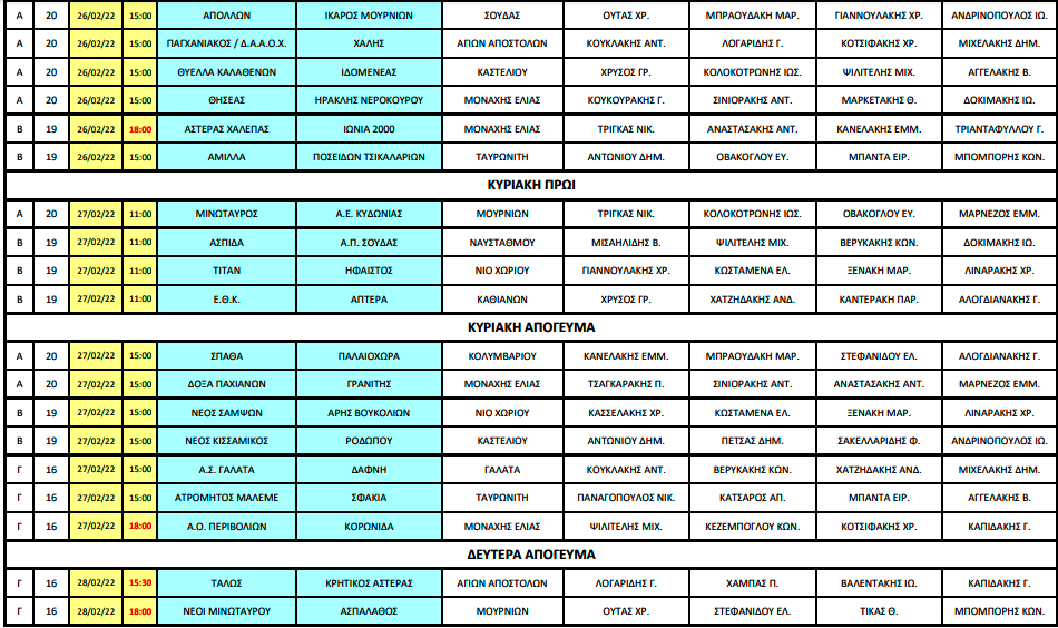 ΤοπικόΕΠΣΧ: Οι διαιτητές στο τοπικό Χανίων! 24 Φεβ Δείτε τους ορισμούς των διαιτητών στο τοπικό Χανίων για το προσεχές Σαββατοκύριακο. Αναλυτικά: ΣΑΒΒΑΤΟ ΑΠΟΓΕΥΜΑ