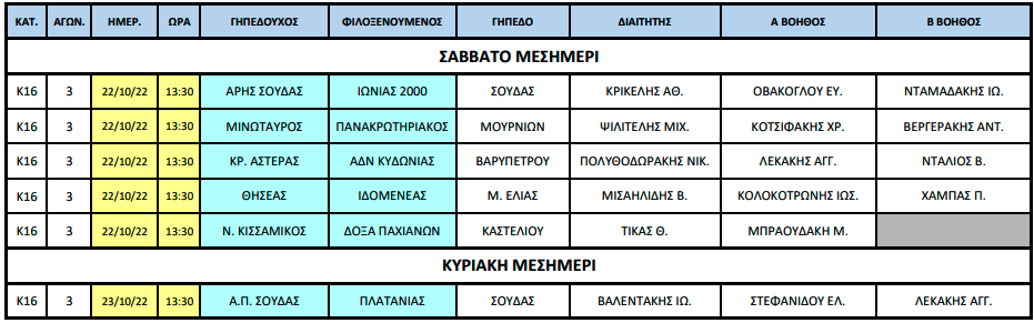 ΤοπικόΕΠΣΧ: Πρόγραμμα και διαιτητές στα Κ16 21 Οκτ Η ΕΠΣ Χανίων ανακοίνωσε τους ορισμούς των διαιτητών και στο πρωτάθλημα Κ16 που επίσης, ξεκινά. Αναλυτικά: