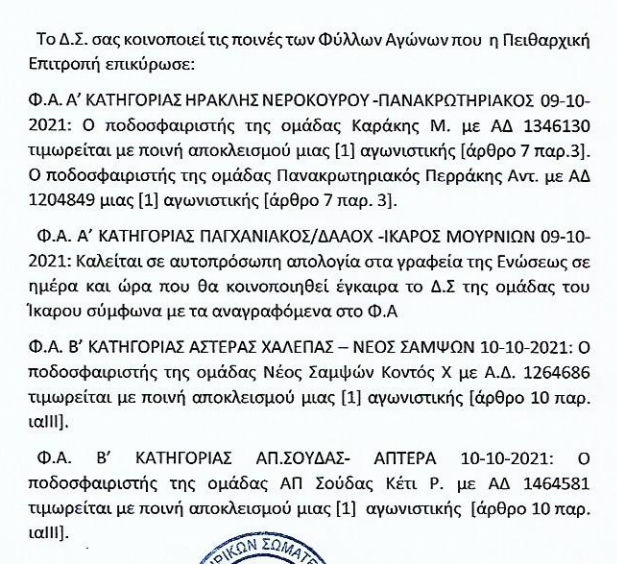 ΤοπικόΕΠΣΧ:Οι ποινές της προηγούμενης αγωνιστικής 16 Οκτ Η ΕΠΣ Χανίων ανακοίνωσε το Ποινολόγιο της προηγούμενης αγωνιστικής στα τοπικά Χανίων. Αναλυτικά:
