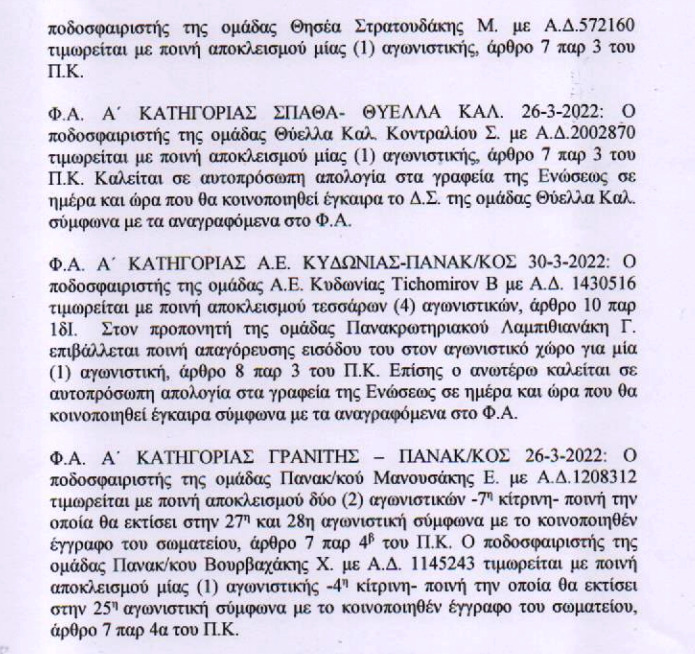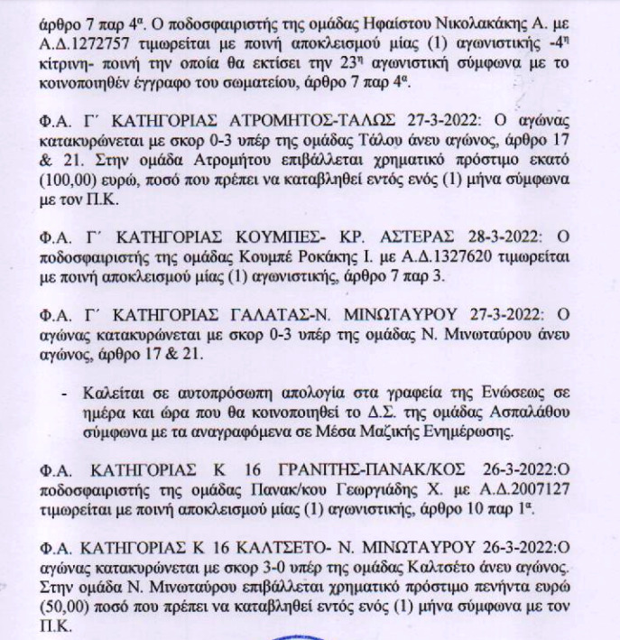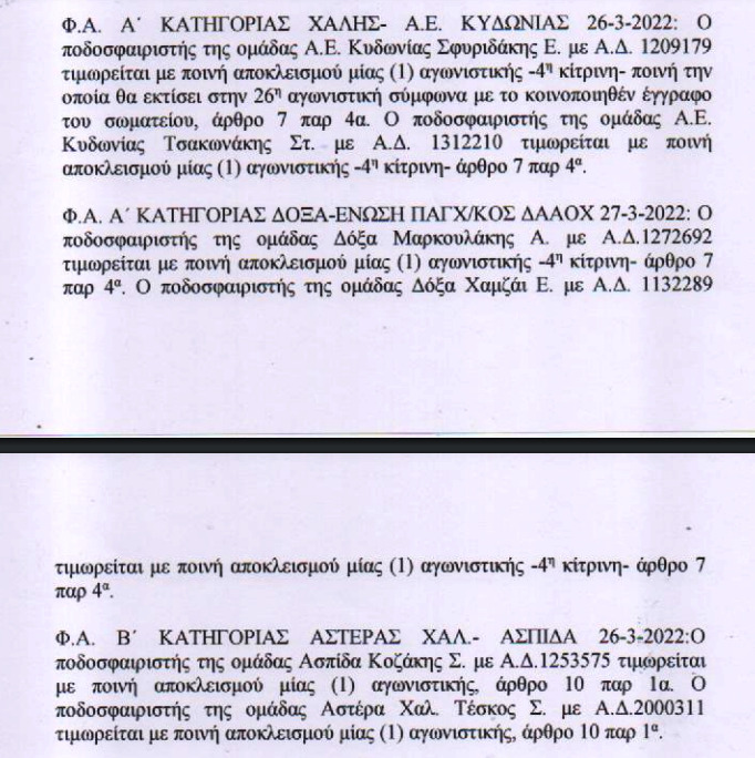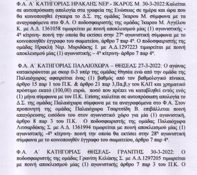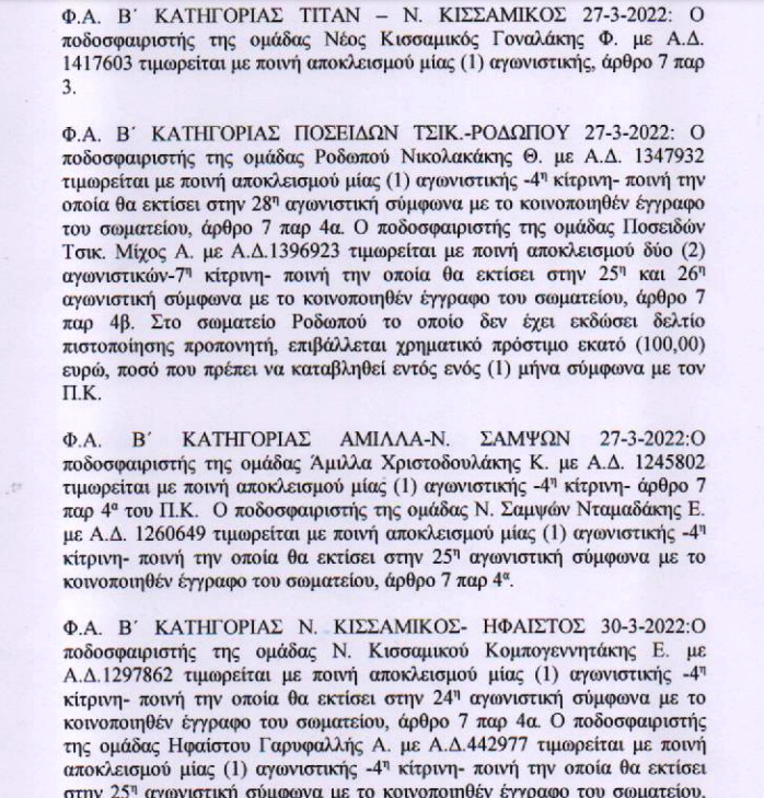 Η ΕΠΣ Χανίων ανακοίνωσε τις ποινές των δύο προηγούμενων αγωνιστικών, η εκ των οποίων “εμβόλιμη”.