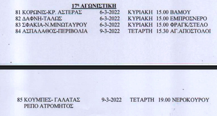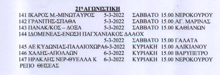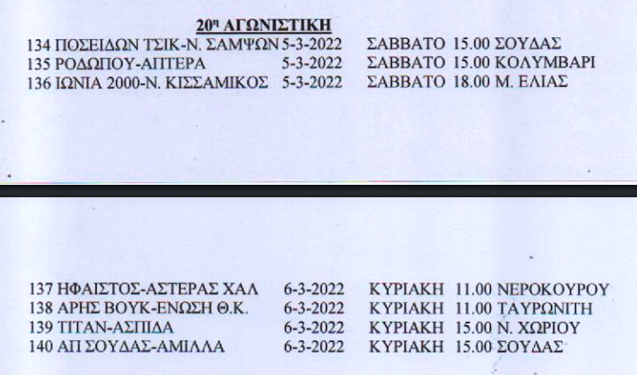 Τοπικό, IN THE SPOTLIGHTΕΠΣΧ: Το πρόγραμμα Σαββατοκύριακου στο τοπικό Χανίων 01 Μαρ Δείτε το πρόγραμμα και στις τρεις κατηγορίες του τοπικού, το Σαββατοκύριακο (τελευταίο της αποκριάς). Αναλυτικά: Α’ ΕΠΣΧ Β’ ΕΠΣΧ Γ’ ΕΠΣΧ