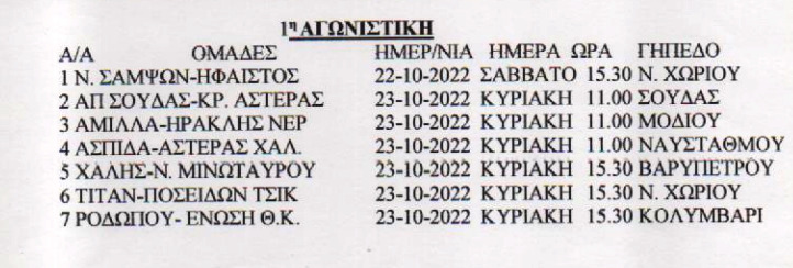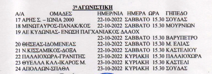 ΤοπικόΕΠΣΧ: Το πρόγραμμα σε Α’ και Β’ κατηγορία στο τοπικό Χανίων! 20 Οκτ Κανονικά ξεκινά και η Β’ κατηγορία (από την 1η αγωνιστική), όπως και η Α’ κατηγορία (από την 3η αγωνιστική). Δείτε τα προγράμματα της ΕΠΣ Χανίων: Α’ ΕΠΣΧ Β’ ΕΠΣΧ