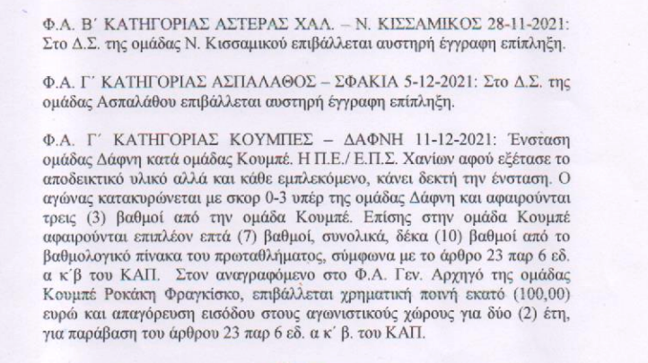 Πολύ βαριά καμπάνα ήχησε στο τοπικό Χανίων και βάσει του ΚΑΠ έπεσε βαριά ποινή σε ομάδα.