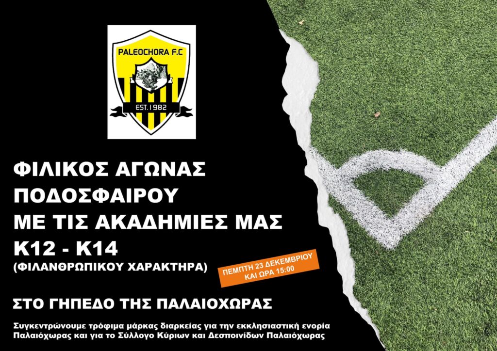 Υποδομές, ΠαλαιόχωραΦιλανθρωπικός αγώνας ακαδημιών στην Παλαιόχωρα 20 Δεκ Σημαντική πρωτοβουλία από την ομάδα της Παλαιόχωρας. Οι ακαδημίες Κ14 και Κ12 της Παλαιόχωρας θα παίξουν σε αγώνα φιλανθρωπικού χαρακτήρα στις 23 Δεκεμβρίου στις 3 το μεσημέρι στο γήπεδο Παλαιόχωρας. Οι λεπτομέρειες στην παρακάτω αφίσα.