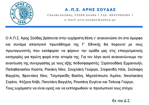 Γ' Εθνική, ΠΛΑΤΑΝΙΑΣΓ’ Εθνική: Διψήφιος αριθμός ανανεώσεων στον Άρη Σούδας 27 Μάι 14 ανανεώσεις στον Άρη Σούδας, που “χτίζει” το οικοδόμημα της νέας χρονιάς, παρθενική στη Γ’ Εθνική κατηγορία. Ο κορμός της ομάδας λοιπόν είναι έτοιμος και μένει να δούμε τις προσθήκες. Η ανακοίνωση του Άρη Σούδας: