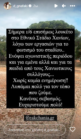 Απογοητευμένη η Χανιώτισσα πρωταθλήτρια στίβου Δήμητρα Γναφάκη για το γεγονός ότι έκλεισε το Εθνικό Στάδιο Χανίων, χωρίς ενημέρωση, για εργασίες.