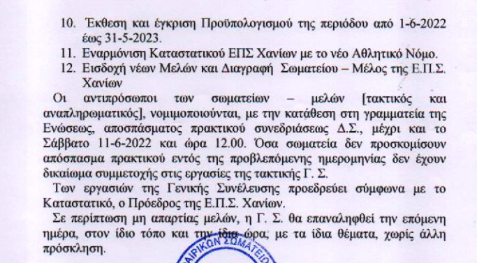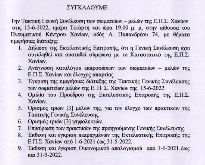 ΤοπικόH ΕΠΣ Χανίων συγκαλεί Γενική Συνέλευση 29 Απρ Πότε θα πραγματοποιηθεί η Τακτική Γενική Συνέλευση της ΕΠΣΧ. Η σχετική πρόσκληση στα σωματεία-μέλη: