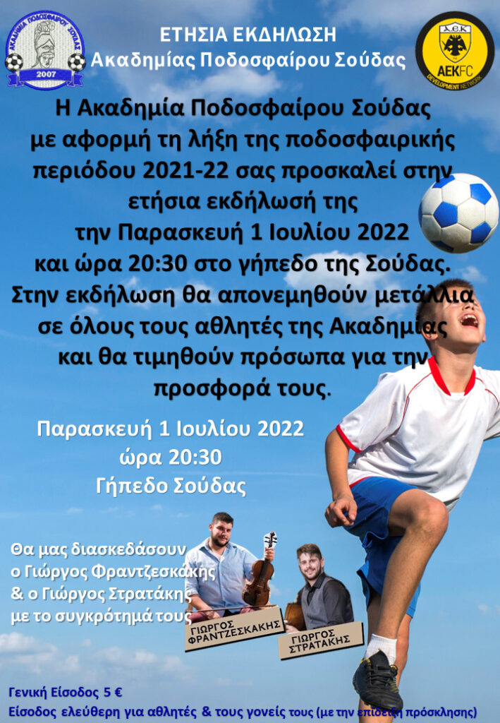 Από την Ακαδημία Ποδοσφαίρου Σούδας ανακοινώνεται ότι η ποδοσφαιρική σεζόν 2021-22 για τα τμήματα της Ακαδημίας ολοκληρώνεται την Πέμπτη 30 Ιουνίου 20211.Με αφορμή τη λήξη της ποδοσφαιρικής περιόδου, την Παρασκευή 1 Ιουλίου 2022 και ώρα 20:30 στο γήπεδο της Σούδας θα πραγματοποιηθεί η καθιερωμένη ετήσια εκδήλωση μας. Στην εκδήλωση θα απονεμηθούν μετάλλια σε όλους τους αθλητές μας, θα τιμηθούν πρόσωπα για την προσφορά τους στον αθλητισμό και θα μας διασκεδάσουν ο Γιώργος Φραντζεσκάκης και ο Γιώργος Στρατάκης με το συγκρότημά τους.