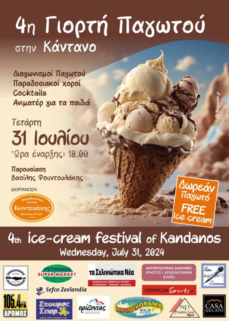 Η 4η γιορτή παγωτού θα πραγματοποιηθεί την Τετάρτη 31 Ιουλίου στις 18.00 στην Κάντανο, έξω από το ζαχαροπλαστείο του Γιάννη Κοντεκάκη.