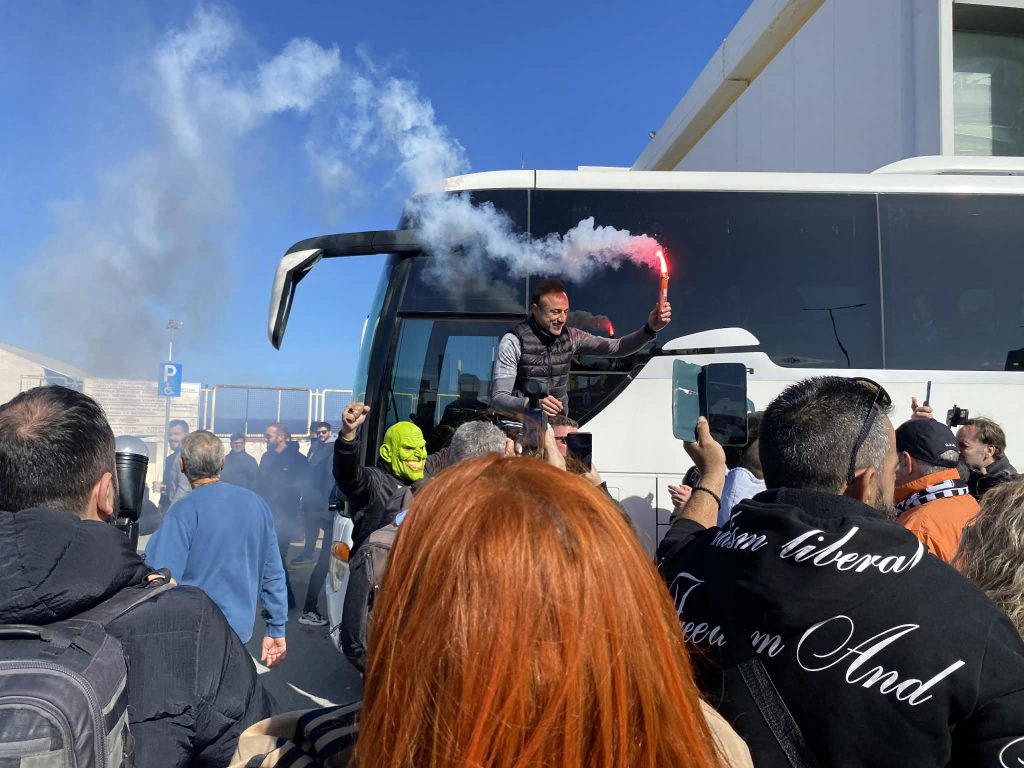 Το ίδιο συνέβη και μόλις εμφανίστηκε στην αίθουσα υποδοχής του αεροδρομίου Ηρακλείου όπου ο κόσμος τον σήκωσε στους ώμους του πηγαίνοντας τον μέχρι και το λεωφορείο του ΟΦΗ ενώ στην συνέχεια σε ένα τρομερό στιγμιότυπο, ο Χρήστος Κόντης πήρε ένα καπνογόνο κραδαίνοντας τον στον αέρα και φωνάζοντας συνθήματα!