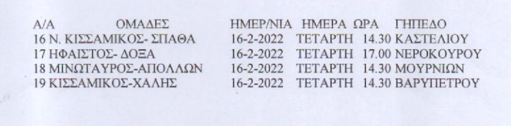 Τα ματς θα γίνουν την Τετάρτη (16/2).