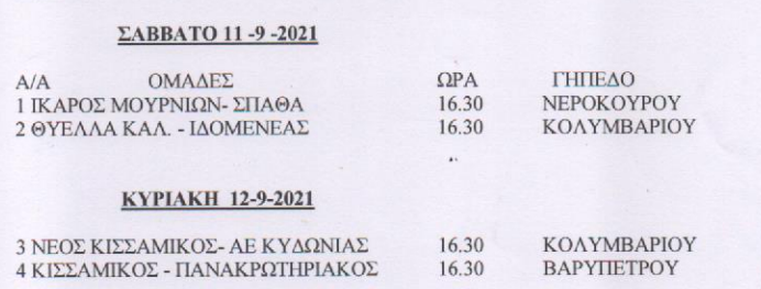 Τοπικό, IN THE SPOTLIGHTΚύπελλο Χανίων: Το πρόγραμμα του Σαββατοκύριακου 07 Σεπ Τέσσερις αναμετρήσεις θα πραγματοποιηθούν το Σαββατοκύριακο για το Κύπελλο Χανίων. Τα δύο ματς είναι το Σάββατο (11/9) και τα άλλα δύο την Κυριακή (12/9). Αναλυτικά το πρόγραμμα όπως το ανάρτησε η ΕΠΣ Χανίων: