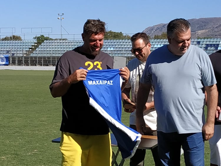 Μάλιστα δόθηκε και μια μπλούζα του Άρη Σούδας στον Ηλία Μαχαίρα, αλλά σε μορφή μπασκετική, γιατί ο Χανιώτης προπονητής, μετά το πόλο αγαπά πιο πολύ το μπάσκετ.