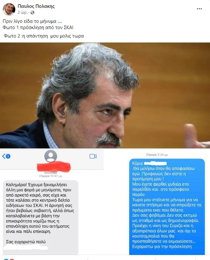 Στην τελευταία του ανάρτηση ο Παύλος Πολάκης δημοσιεύει το μήνυμα που του έστειλε δημοσιογράφος προκειμένου να μιλήσει στο κεντρικό δελτίο ειδήσεων του ΣΚΑΙ, καθώς και την… απάντησή του.