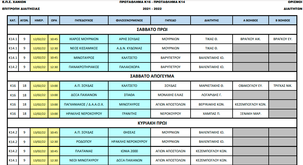 ΤοπικόΟι διαιτητές στα πρωταθλήματα υποδομής της ΕΠΣ Χανίων 11 Φεβ Οι διαιτητές στις κατηγορίες Κ16 και Κ14 για τα ματς του Σαββατοκύριακου. Όπως τους ανακοίνωσε η ΕΠΣΧ