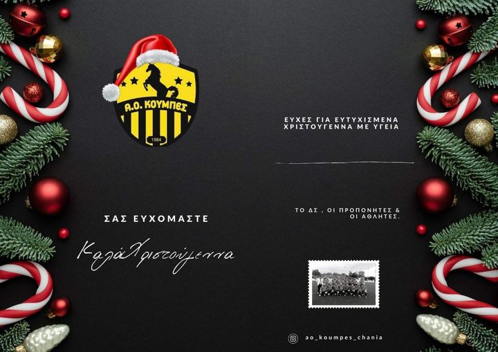 “Τo Δ.Σ. του Αθλητικού Σωματείου ‘’ΑΟ ΚΟΥΜΠΕ’’ εύχονται σε όλους τους αθλητές και τις αθλήτριες όλων των αθλητικών τμημάτων, στους τεχνικούς, στα μέλη και στους φίλους του Σωματείου μας και σε όλους τους φίλους του Ελληνικού Αθλητισμού, Χρόνια Πολλά, καλά Χριστούγεννα και τις καλύτερες ευχές για το νέο έτος 2023 με υγεία, χαρά, χαμόγελα, αγάπη, ευτυχία, ειρήνη, δύναμη, ελευθερία, πρόοδο και επιτυχίες ατομικές, ομαδικές και οικογενειακές