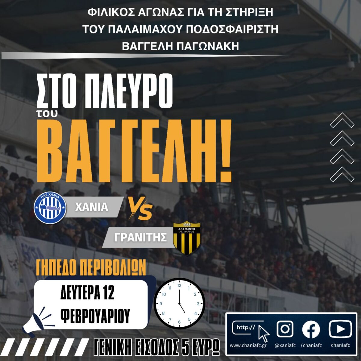 Η ΠΑΕ ΧΑΝΙΑ και ο Α.Π.Σ. Γρανίτης Αγίας Μαρίνας καλούν τον φίλαθλο κόσμο των Χανίων να δώσει το παρών στον μεταξύ τους φιλικό αγώνα φιλανθρωπικού χαρακτήρα, που θα διεξαχθεί την ερχόμενη Δευτέρα 12 Φεβρουαρίου στις 5:00 μ.μ. στο γήπεδο Περιβολίων.