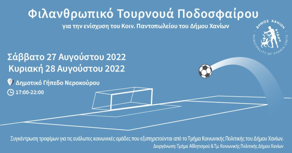 Διήμερο τουρνουά ποδοσφαίρου διοργανώνεται στο δημοτικό γήπεδο Νεροκούρου το Σάββατο 27 και την Κυριακή 28 Αυγούστου, από τις 17:00 έως τις 22:00. Το τουρνουά διοργανώνεται από το Τμήμα Αθλητισμού του Δήμου Χανίων, σε συνεργασία με το Τμήμα Κοινωνικής Πολιτικής του Δήμου και την Ε.Π.Σ. Χανίων.
