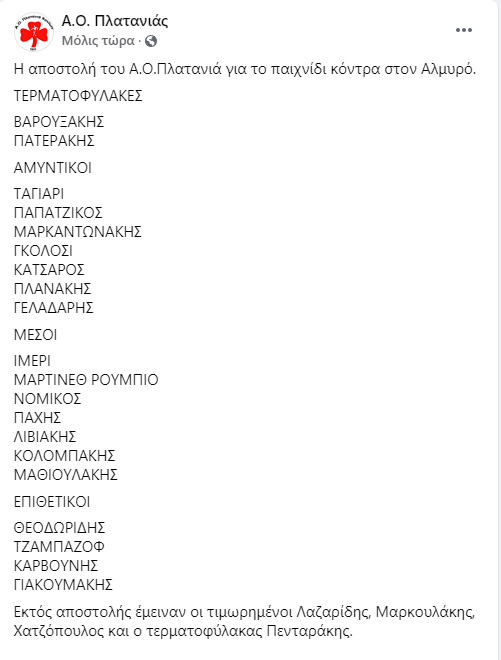 Πλατανιάς: Η αποστολή για το ματς με Αλμυρό