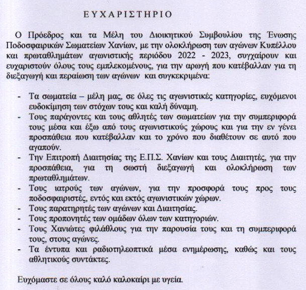 ΤοπικόΠοιους ευχαριστεί η ΕΠΣ Χανίων 17 Ιούν Ευχαριστήρια ανακοίνωση της ΕΠΣΧ με αφορμή τη λήξη της φετινής περιόδου. Αναλυτικά: