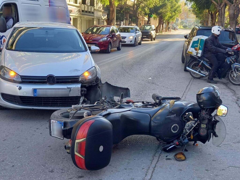 Το τροχαίο προκλήθηκε σήμερα στην οδό Ανδρέα Παπανδρέου, όταν ένα αυτοκίνητο συγκρούστηκε με μια μηχανή.