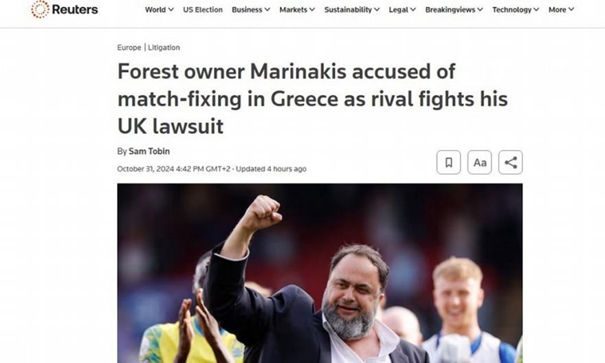 Το ρεπορτάζ του Reuters, λοιπόν, έχει τίτλο «Ο ιδιοκτήτης της Φόρεστ, Μαρινάκης, κατηγορείται για στημένους αγώνες στην Ελλάδα, καθώς ο αντίπαλος μάχεται τη μήνυσή του στο Ηνωμένο Βασίλειο» και μέσα γίνεται εκτενής αναφορά στην υπόθεση, ενώ μεταφέρονται όσα ειπώθηκαν στη δίκη, σήμερα (31/10), στο Λονδίνο!