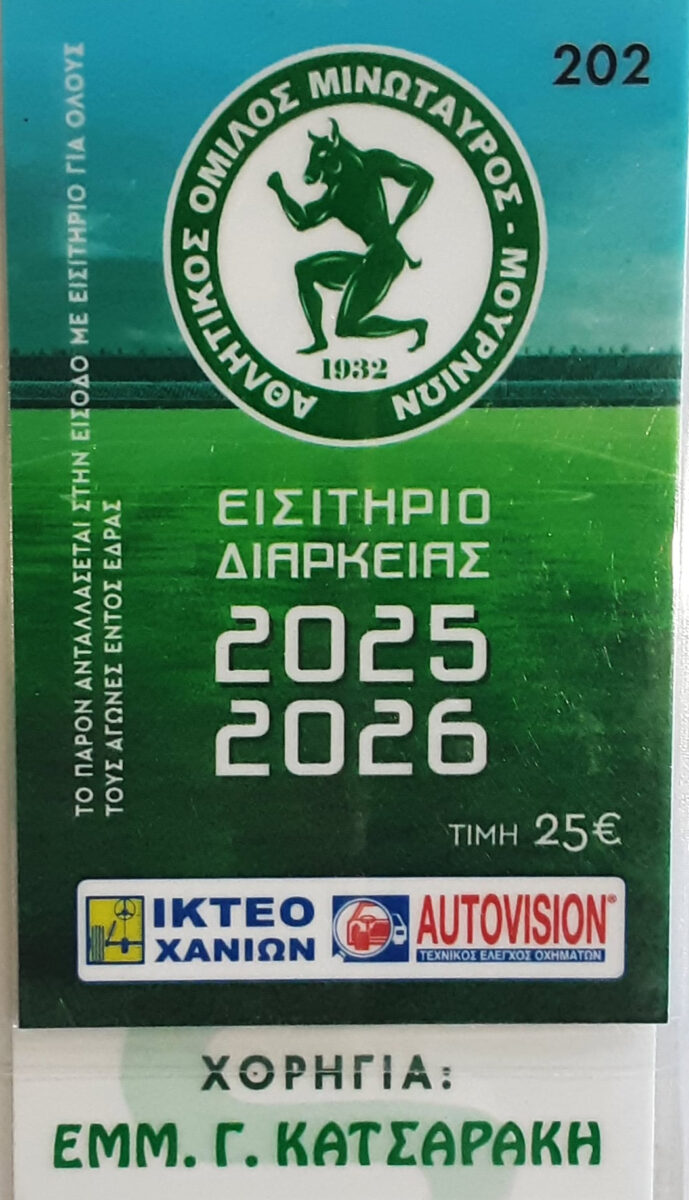 Η φετινή κάρτα διαρκείας συνοδεύεται από την προσωπική χορηγία του κ. Μανόλη Κατσαράκη, προέδρου του Φαρμακευτικού Συλλόγου Χανίων και γενικού γραμματέα του Πανελλήνιου Φαρμακευτικού Συλλόγου, τον οποίο ο Μινώταυρος ευχαριστεί θερμά για τη διαχρονική του στήριξη.