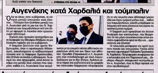 Πρωτοσέλιδο δημοσίευμα της εφημερίδας “Το Παρόν” κάνει λόγο για κόντρα του υφυπουργού αθλητισμού Λ. Αυγενάκη με τον υφυπουργό πολιτική προστασίας, Ν. Χαρδαλιά.