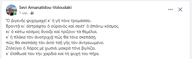 Η σύζυγος του Μανούσου Βολουδάκη επέλεξε τους παρακάτω στίχους από το παραδοσιακό τραγούδι για μια ανάρτηση της στο facebook για να αποχαιρετήσει τον σύζυγο της.