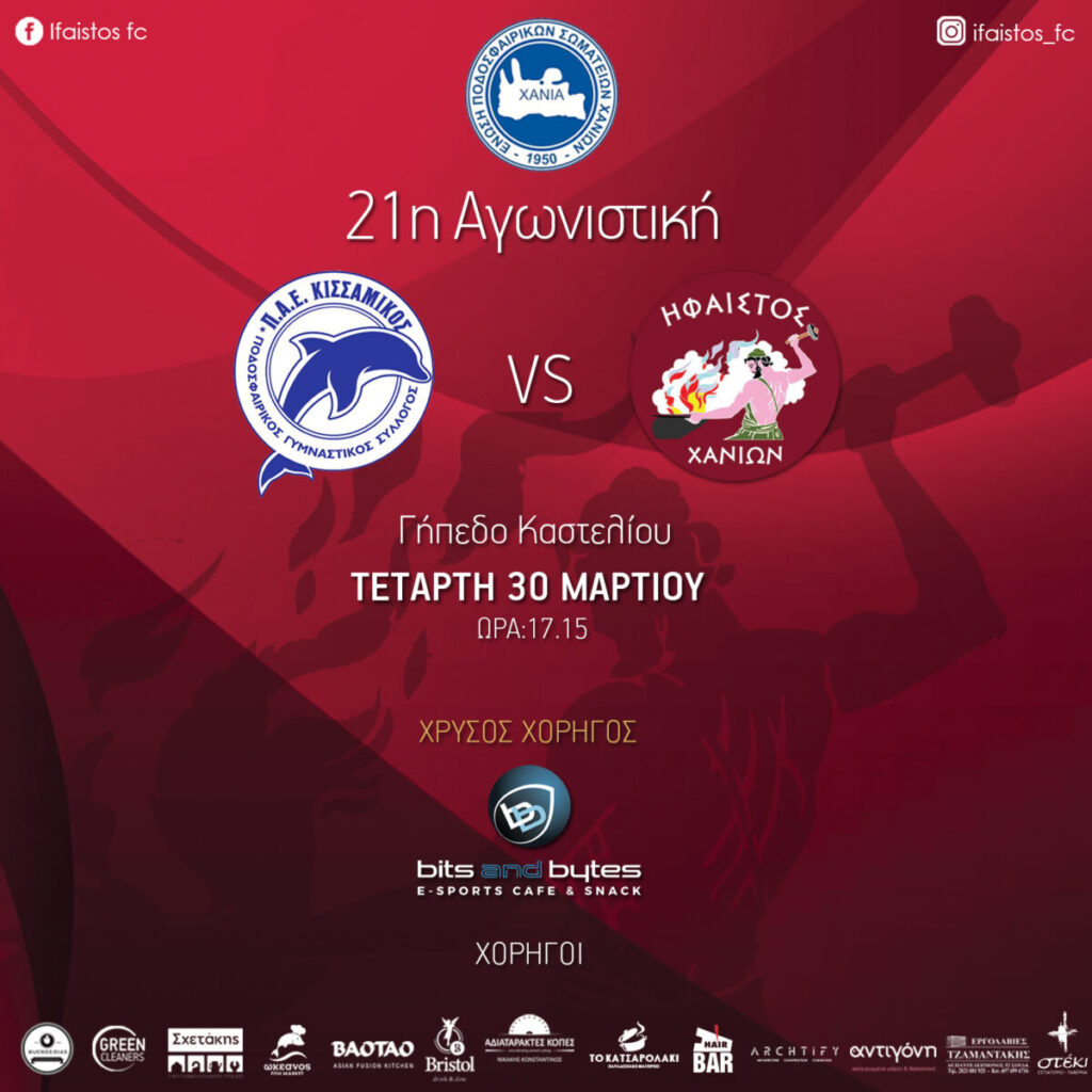 “Το εξ’αναβολής παιχνίδι με το πρωτοπόρο της βαθμολογίας @kissamikos Κισσαμικός ΠΓΣ , στα πλαίσια της 21ης Αγωνιστικής του Πρωταθλήματος, δίνει η ομάδα μας τη Τετάρτη 30/3 και ώρα 17.15 στο Γήπεδο Καστελίου.Η παρουσία σας είναι πολύτιμη!”.