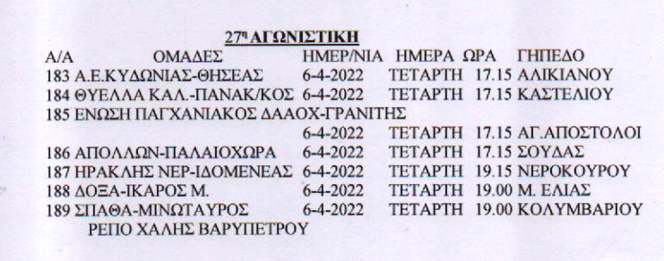 Ορίστηκε επίσης για την Τετάρτη (6/4) στις 16:30 στα Νεροκούρου, το “εξ αναβολής” ματς της 22ης αγωνιστικής της Β’ ΕΠΣΧ, Ήφαιστος – Άπτερα,
