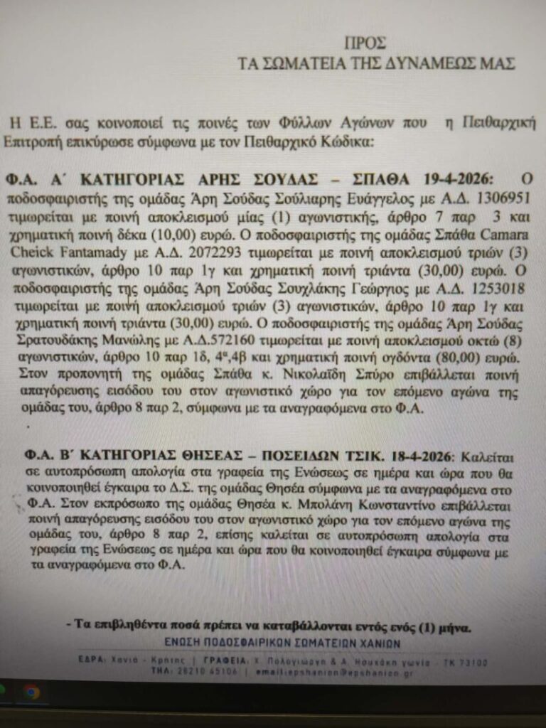 ΤοπικόΤοπικό Χανίων: “Χοντρές καμπάνες” και ποινές για το Άρης Σούδας-Σπάθα 24 Απρ Βαρύς ο “πέλεκυς” της Πειθαρχικής Επιτροπής της ΕΠΣ Χανίων για όσα έγιναν στο Άρης Σούδας-Σπάθα. Αναλυτικά οι ποινές: